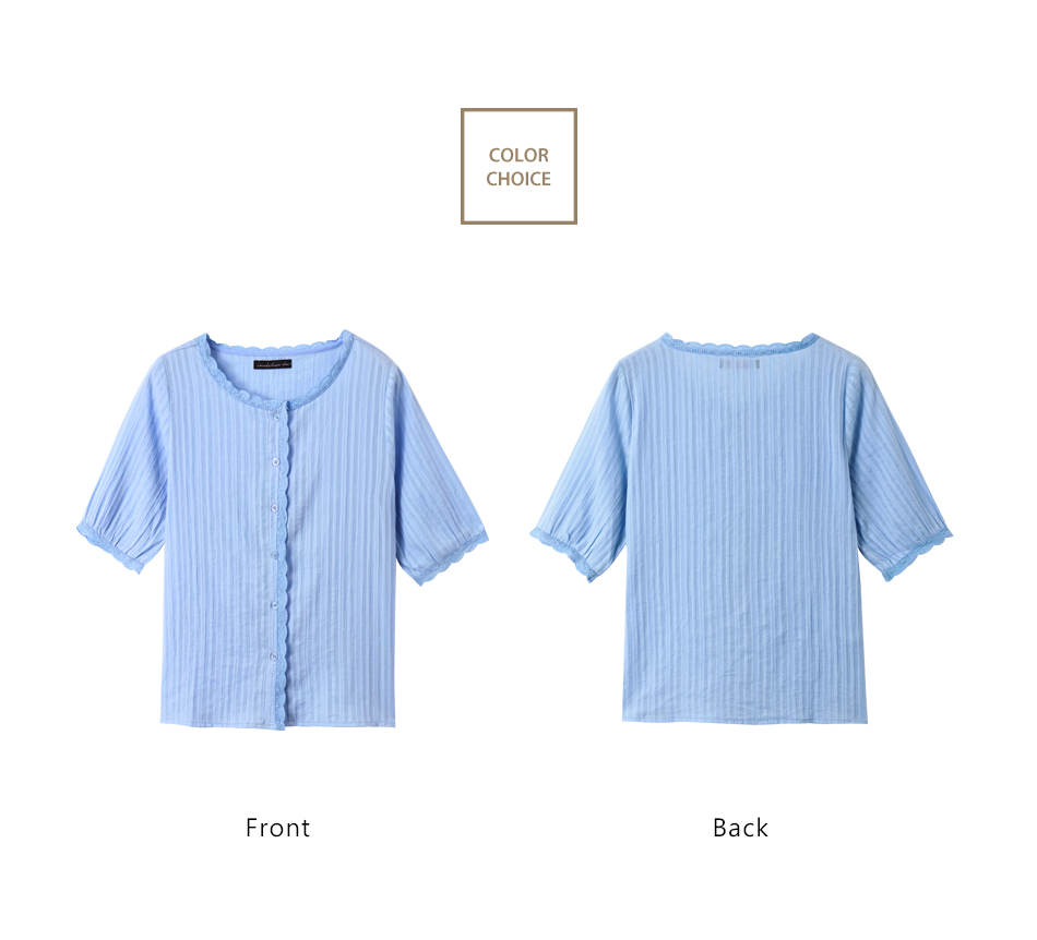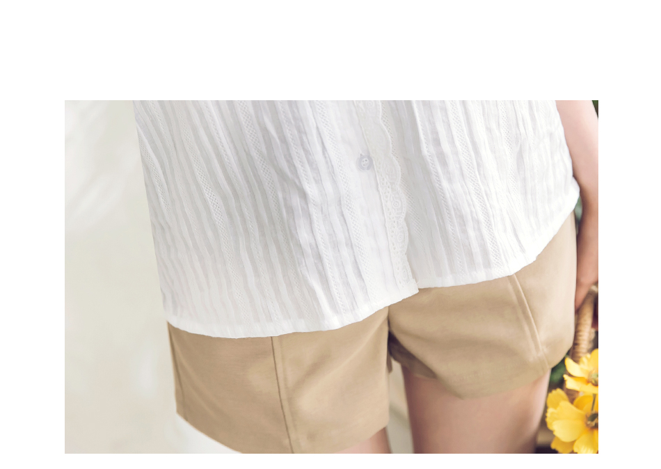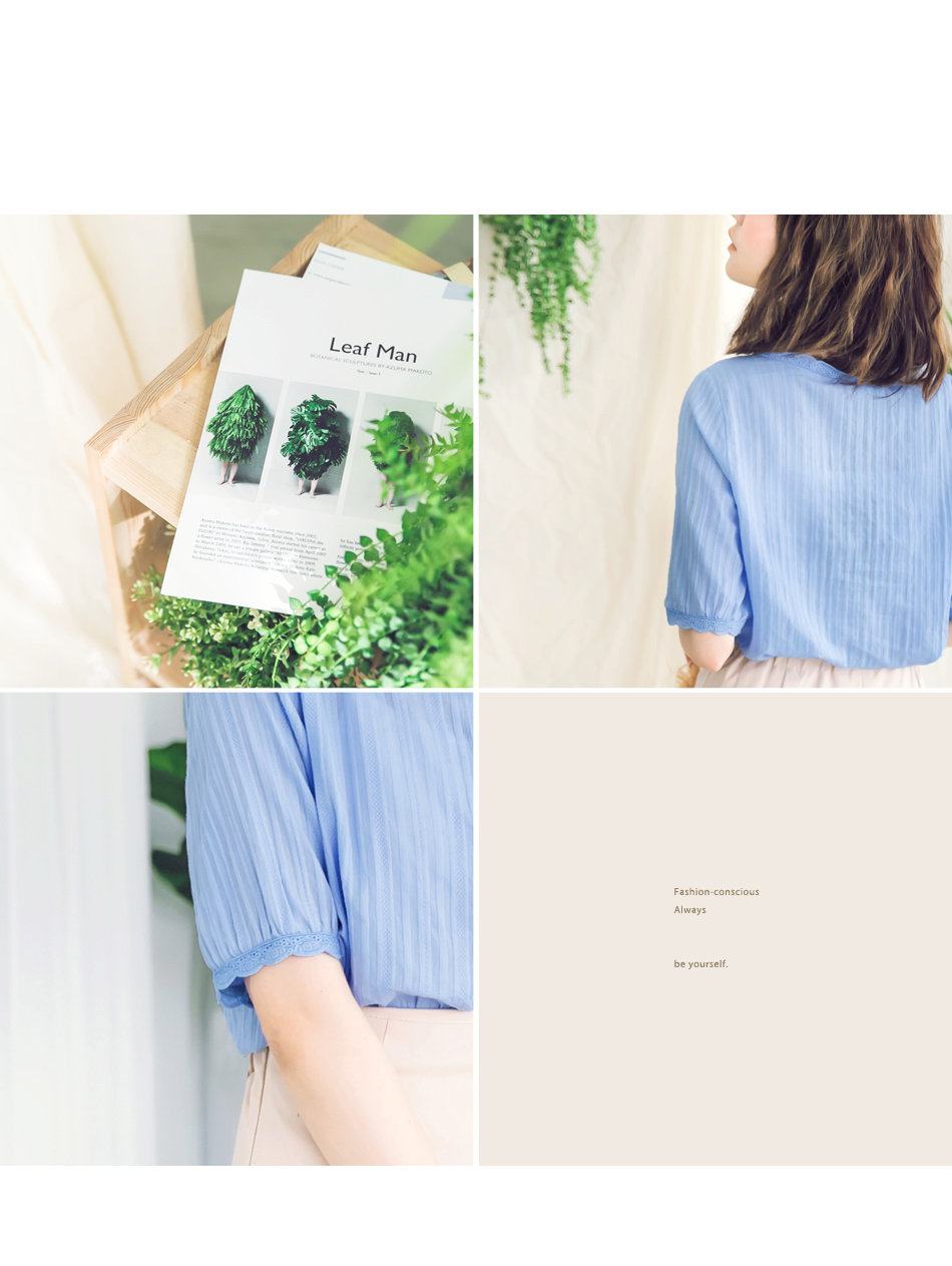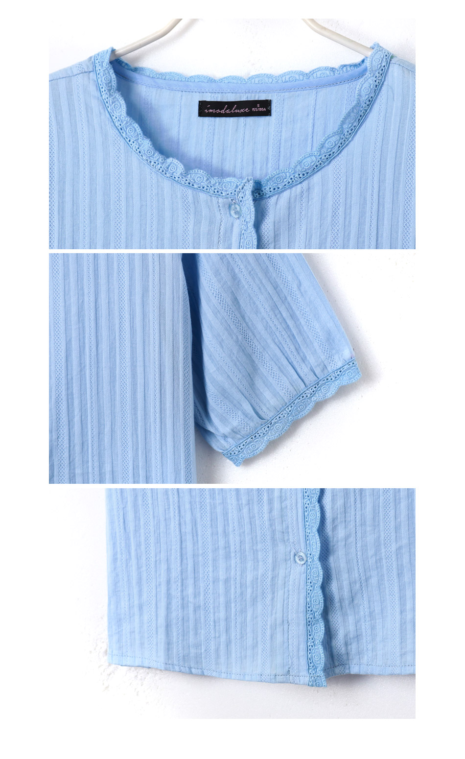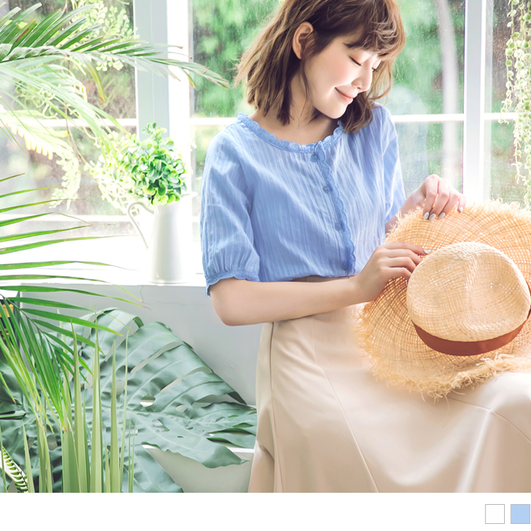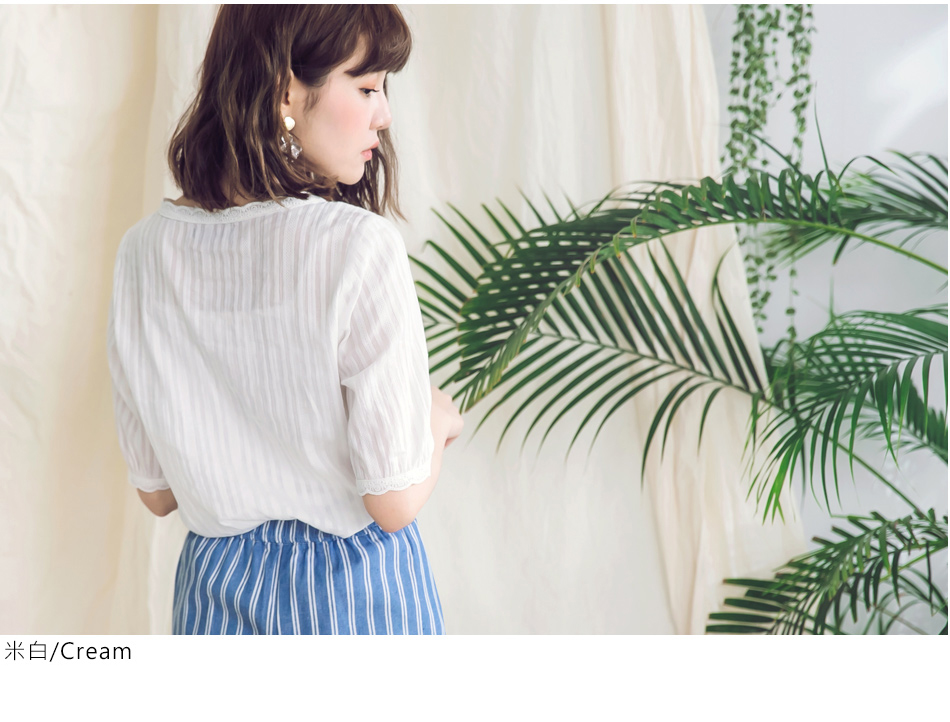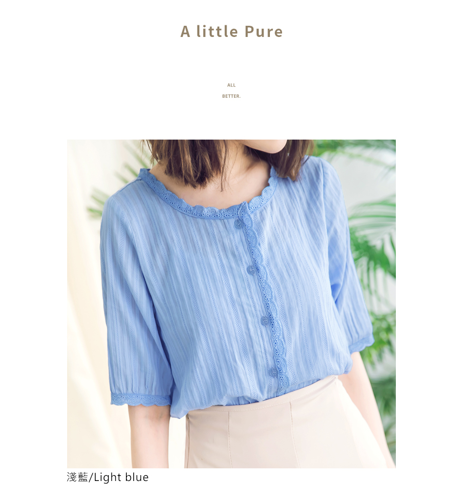 布蕾絲滾邊變化織紋無領短袖襯衫/上衣 ◎獨家◎